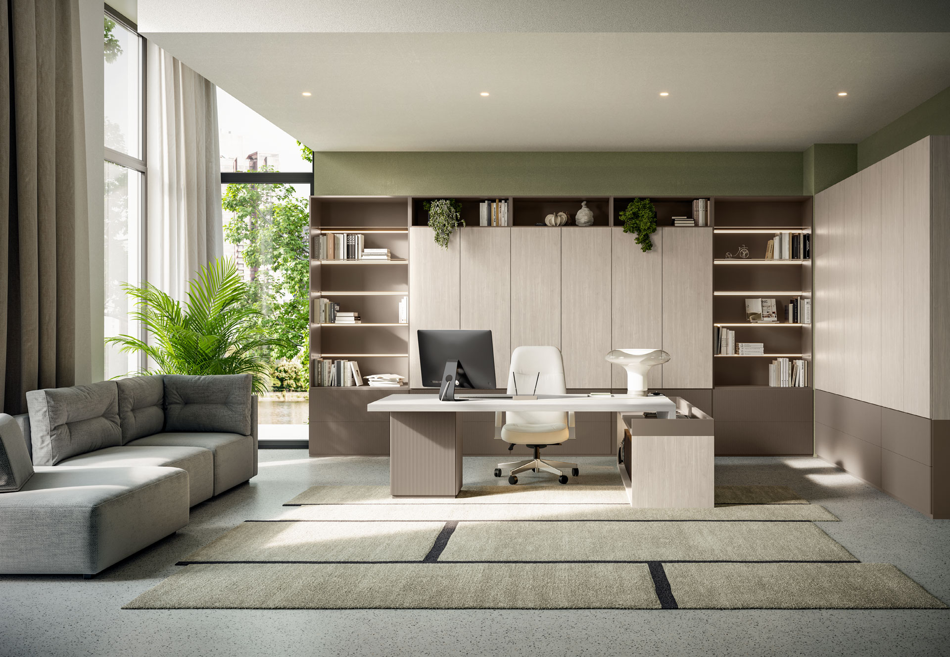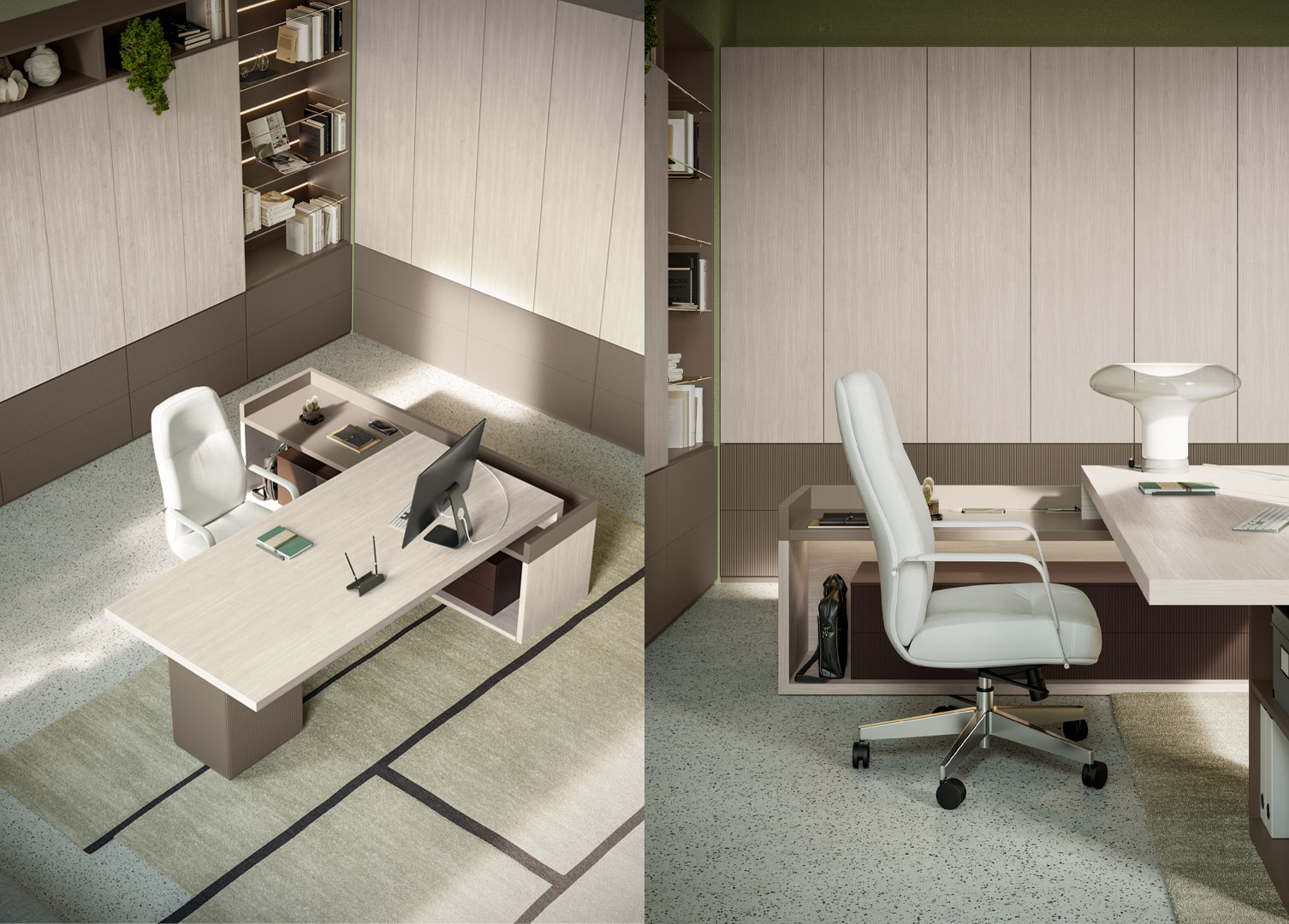 Anche per gli uffici direzionali e le sale meeting, Giessegi introduce arredi sofisticati e pratici. Le nuove scrivanie Cannetè, Island e Freeda si distinguono per design e funzionalità, mentre le librerie a parete, personalizzabili con ante, cassetti e luci LED, completano l’ambiente con stile.